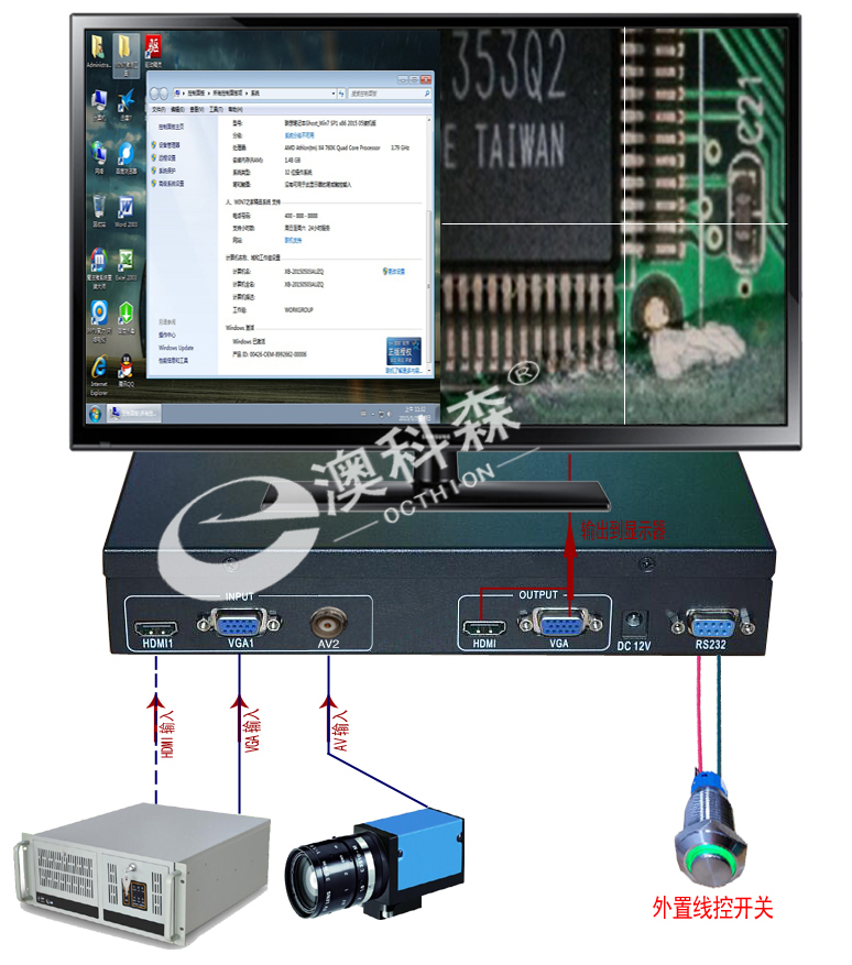 1路VGA和1路HDMI同步輸出接顯示設備 |